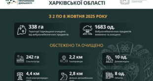З 2 по 8 жовтня включно піротехнічні підрозділи в Харківській області розмінували понад 338 га територій, виявили та знешкодили 1683 вибухонебезпечні предмети. Системну організацію заходів з розмінування та безпеки в …
