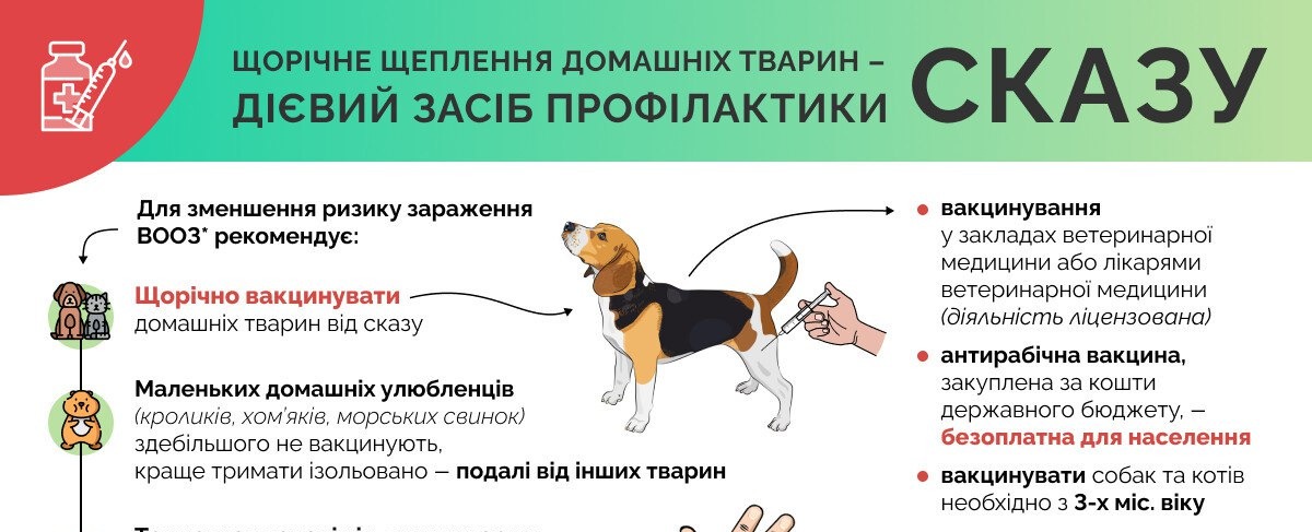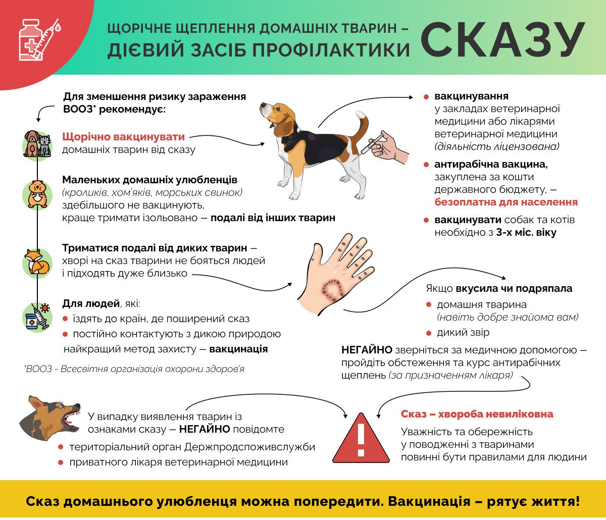 Фахівці вкотре наголошують: сказ — смертельно небезпечне захворювання, яке передається як тваринам, так і людям. Єдиний надійний захист — щорічна вакцинація домашніх тварин, незалежно від того, чи проживають власники у домоволодінні постійно, чи навідуються періодично.