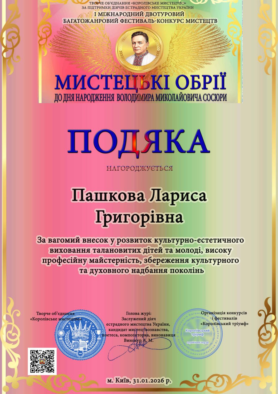 Під керівництвом викладача Пашкової Лариси Григорівни Анастасія продемонструвала наполегливість, музикальність і впевнене володіння інструментом, гідно представивши навчальний заклад на міжнародному рівні.