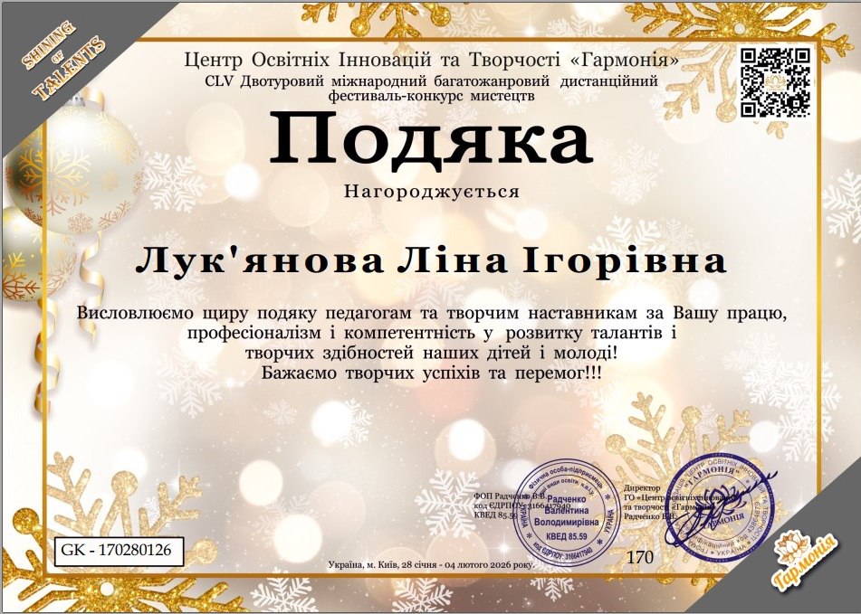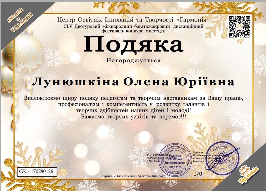 Вокальний ансамбль «Краплинки» Лозівської школи мистецтв №1 та їх керівниця Олена Лунюшкіна здобули І Премію у Двотуровому міжнародному багатожанровому дистанційному фестивалі-конкурсі SHINING OF TALENTS.