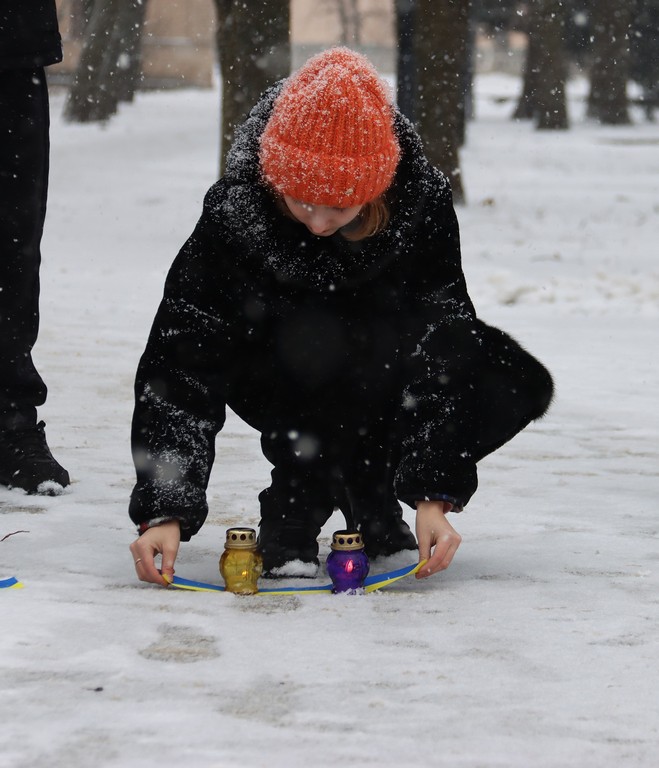 Учасники зібралися, щоб у тиші та зосередженості вшанувати тих, хто віддав життя за свободу й гідність України. Вони повільно вийшли до місця проведення з різних боків скверу, тримаючи запалені свічки та синьо-жовті стрічки. На кілька десятків секунд простір завмер у повній тиші — як знак глибокої шани та спільної пам’яті.