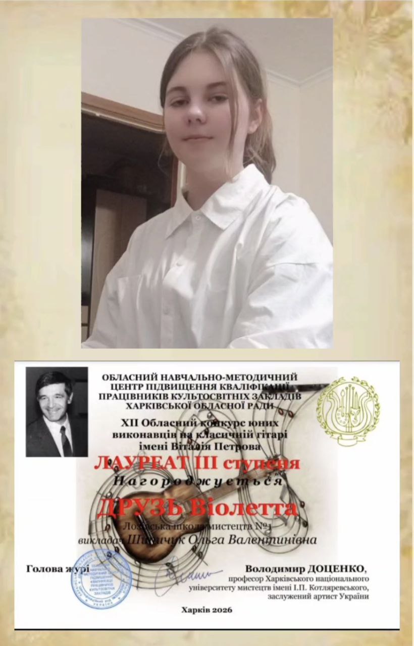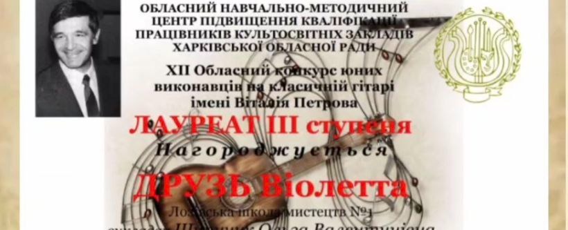 Учениця Лозівської школи мистецтв №1 Друзь Віолетта стала лауреатом ІІІ ступеня ХІІ Обласного конкурсу юних виконавців на класичній гітарі імені Віталія Петрова.