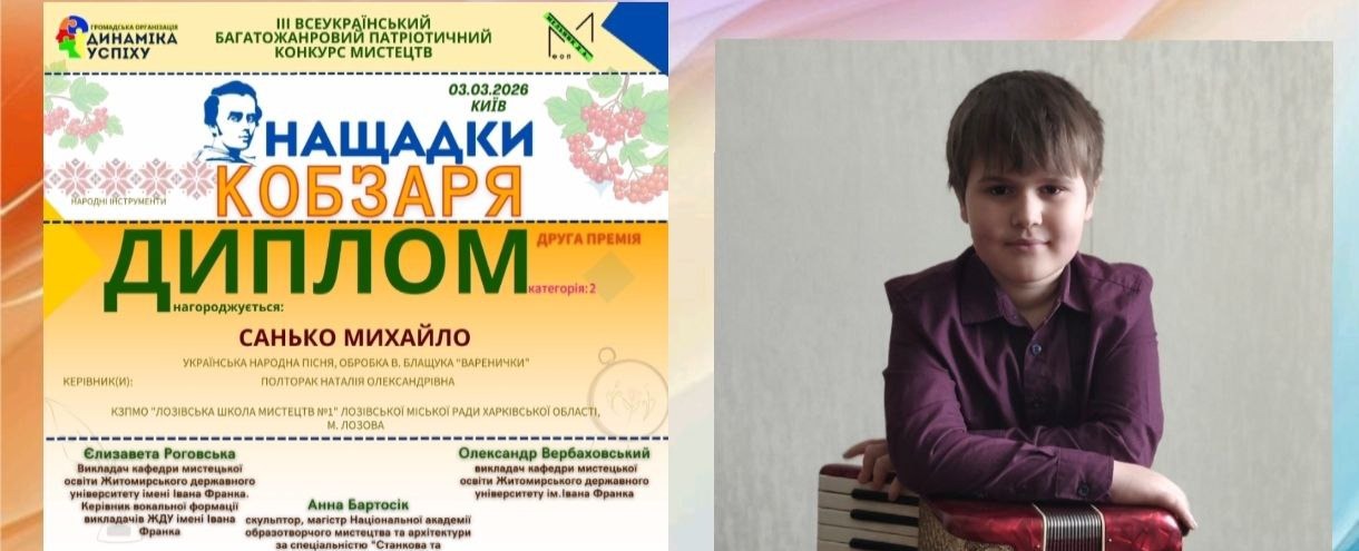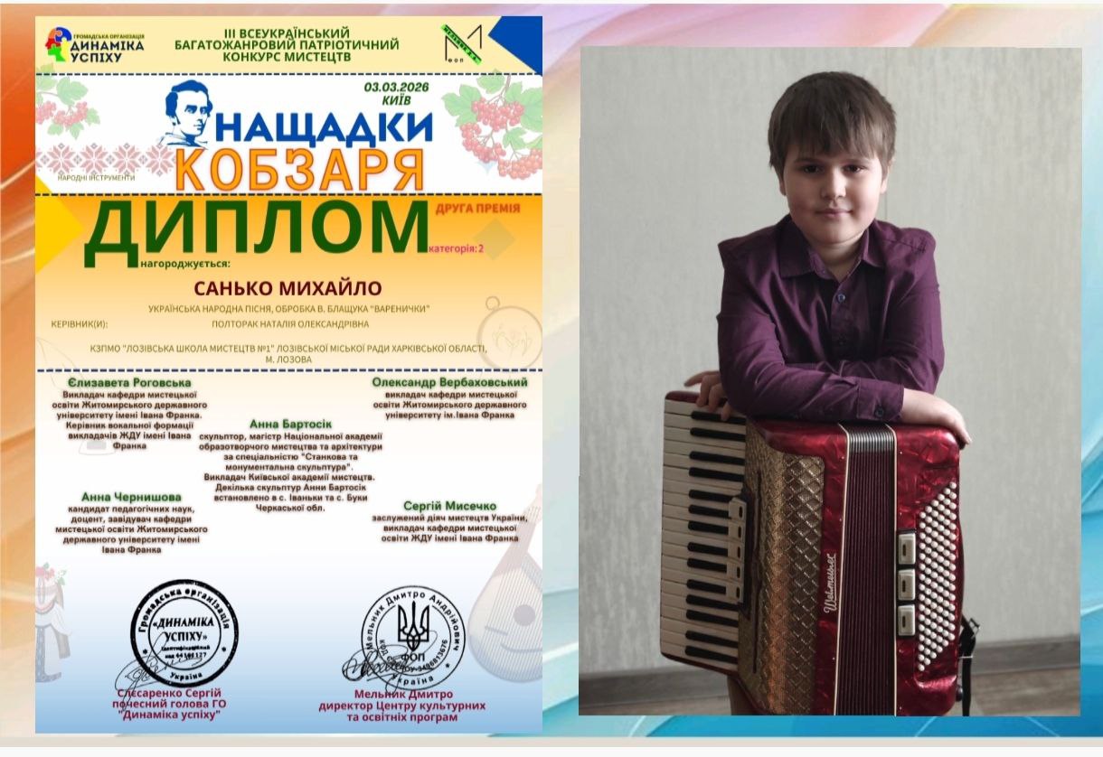 Приємно відзначити, що серед переможців — учень Лозівської школи мистецтв №1 Санько Михайло. Юний митець здобув ІІ премію в номінації «інструментальний жанр», гідно представивши Лозівську громаду на всеукраїнському рівні.