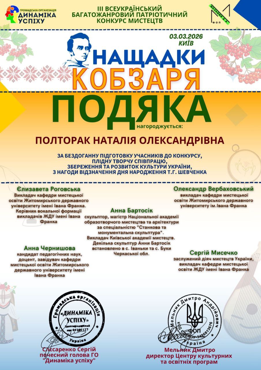 Саме тому ІІІ Всеукраїнський багатожанровий патріотичний конкурс мистецтв «НАЩАДКИ КОБЗАРЯ» об’єднав талановитих учасників з різних куточків України, які через творчість продовжують нести світло української культури та національної ідентичності.