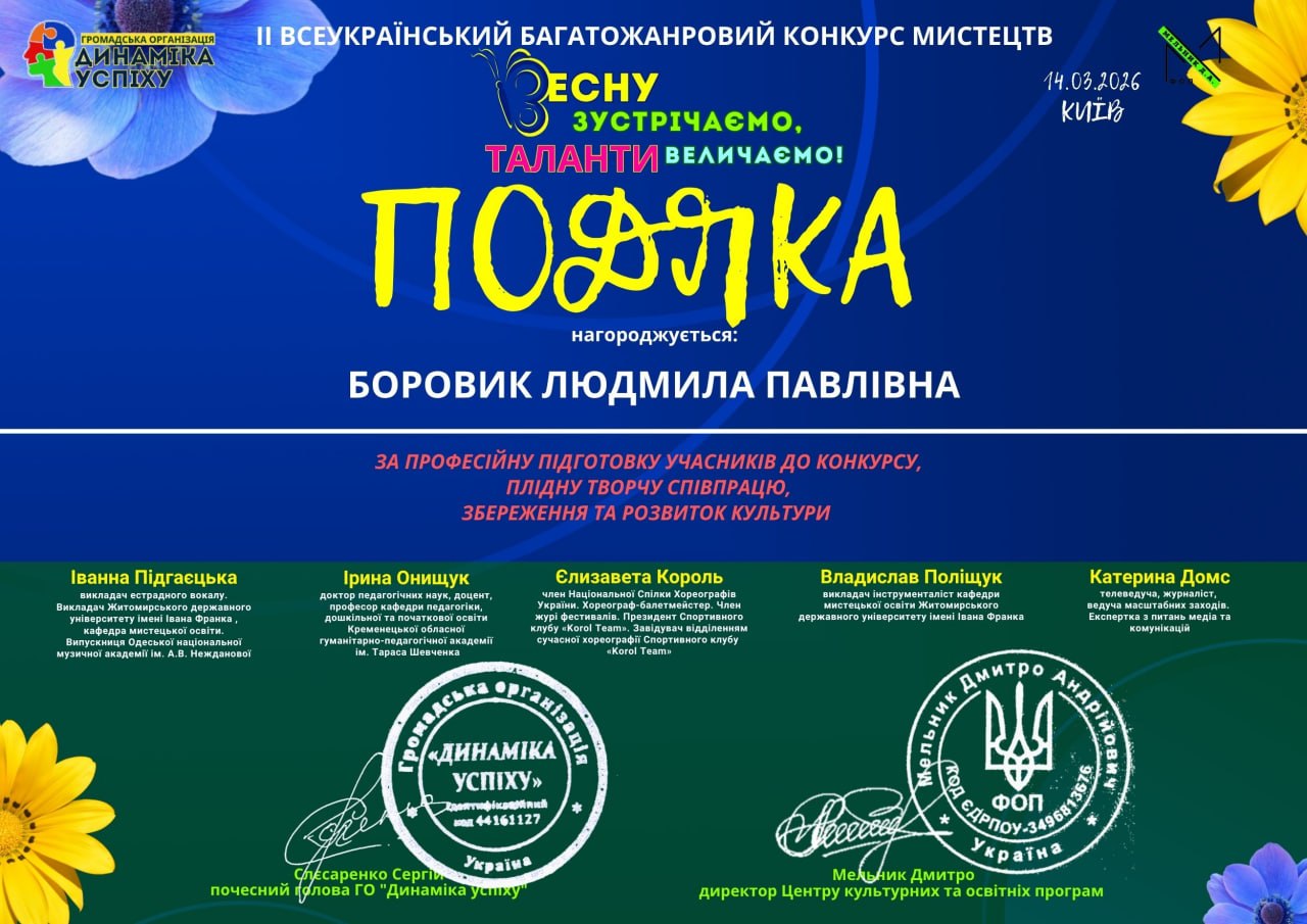Також диплом за професійну підготовку учасниці до конкурсу отримала викладач Людмила Боровик.