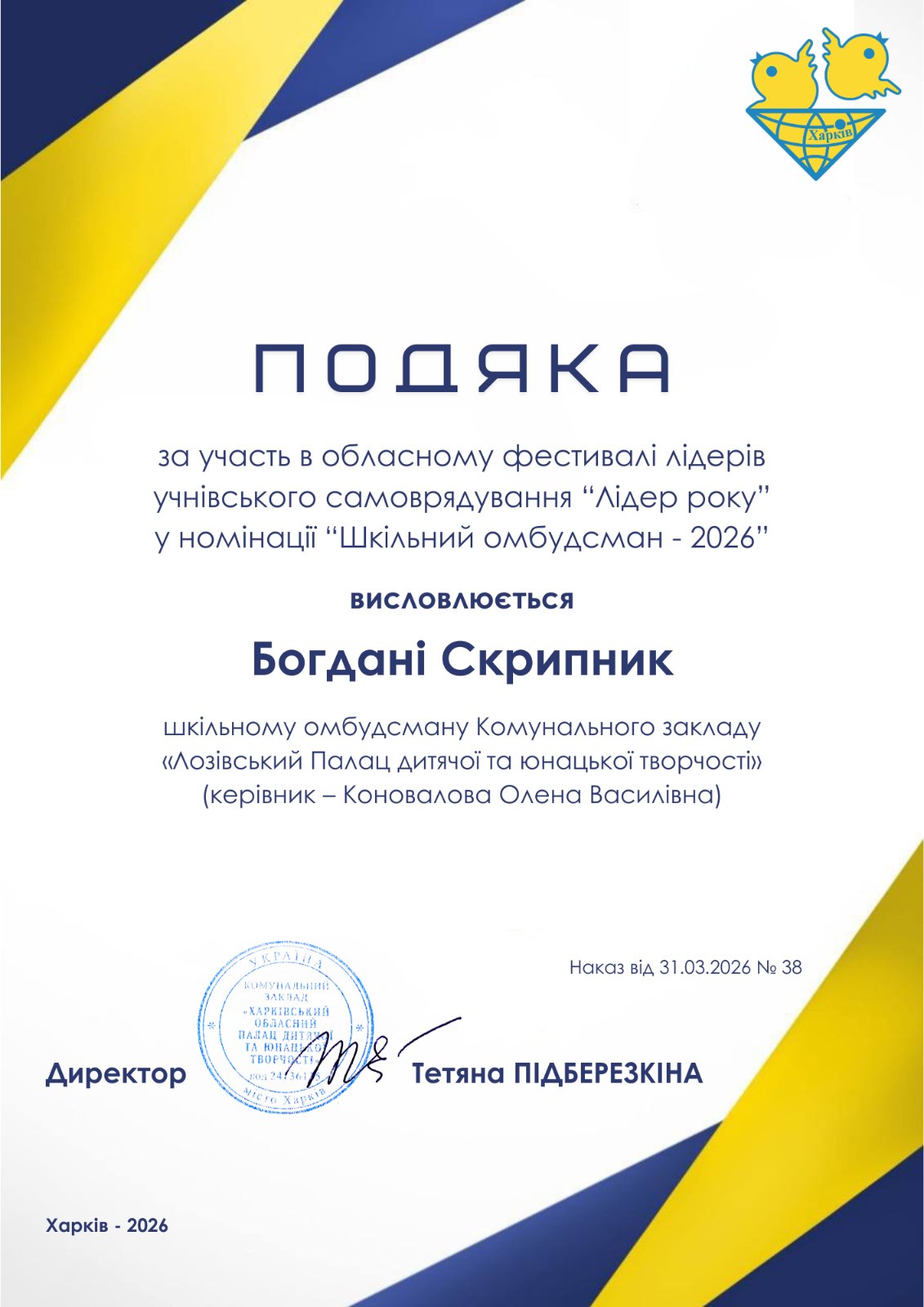 Подяку за активну участь у номінації «Шкільний омбудсмен – 2026» отримала Богдана Скрипник.