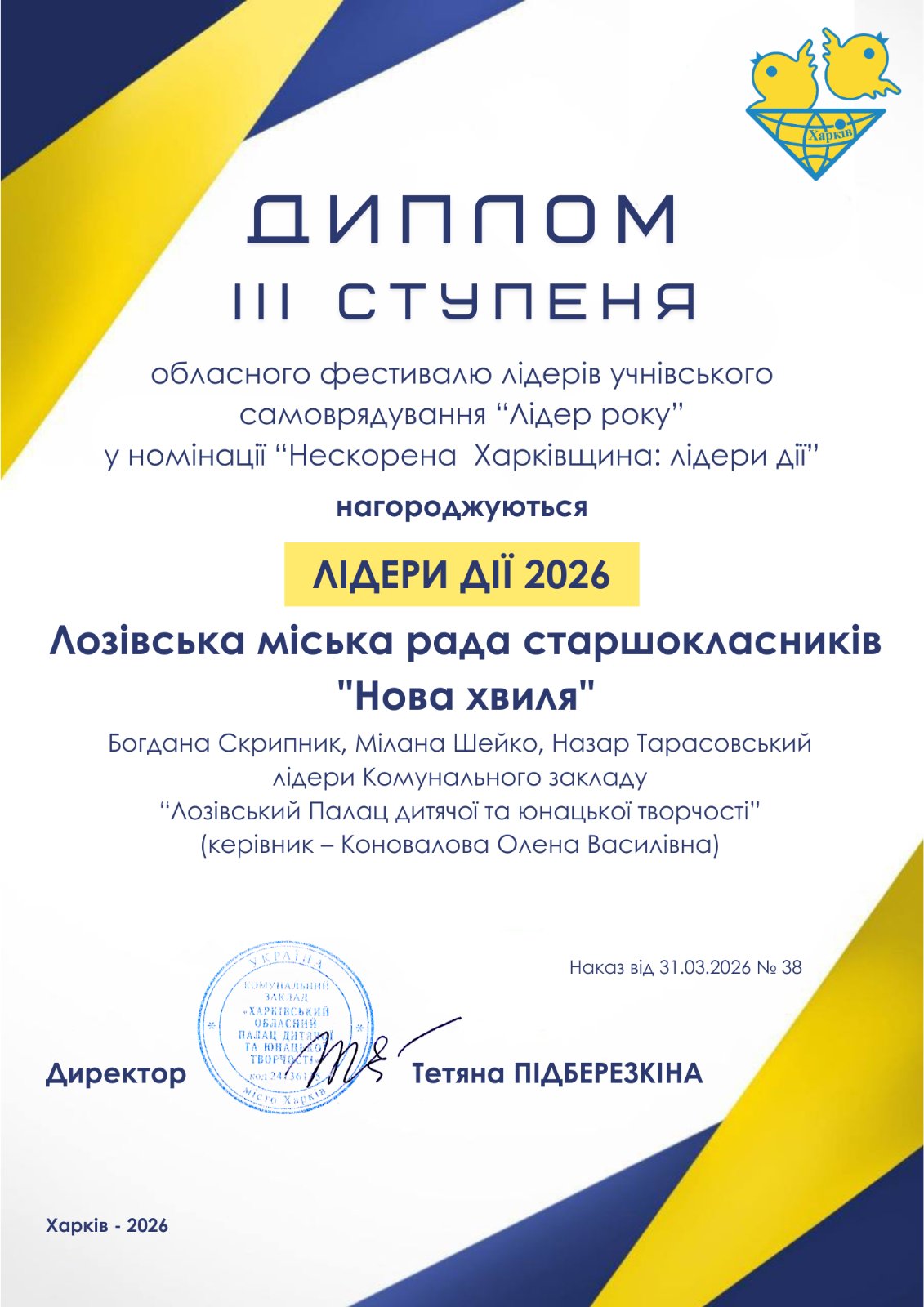 Диплом III ступеня у номінації «Нескорена Харківщина: лідери дії» виборола команда Лозівської міської ради старшокласників «Нова хвиля»! ( Скрипник Богдана, Мілана Шейко, Назар Тарасовський )