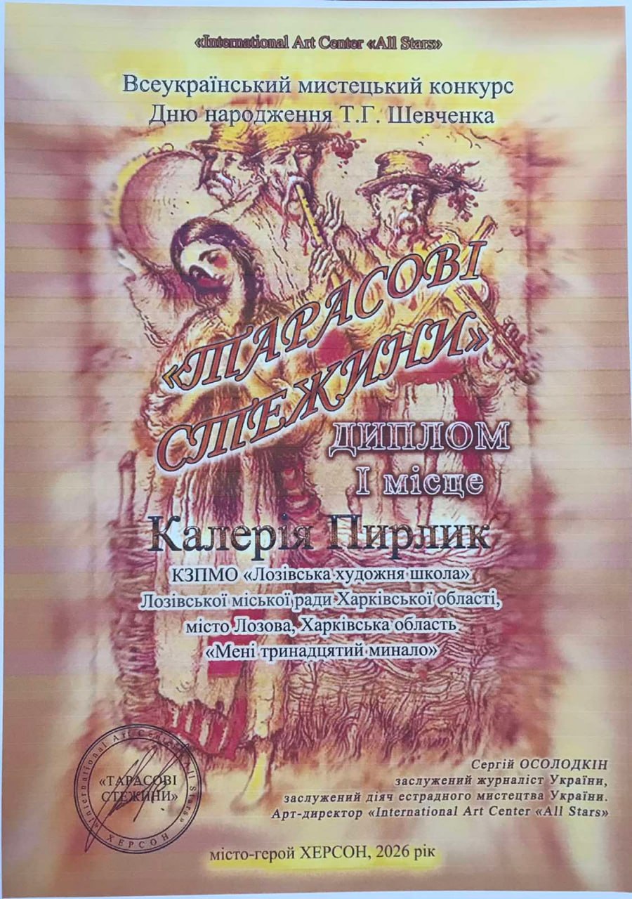 Учениця Лозівської художньої школи Калерія Пирлик (викладач Ольга Михайличенко) здобула перемогу у Всеукраїнському мистецькому конкурсі до Дня народження Т. Г. Шевченка «Тарасові стежини», який проходив онлайн у місті-герої Херсон.
