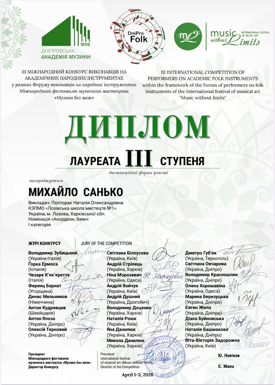 Учень Лозівської школи мистецтв №1 Санько Михайло гідно представив свій навчальний заклад та став Лауреатом ІІІ ступеня серед юних виконавців на баяні та акордеоні.